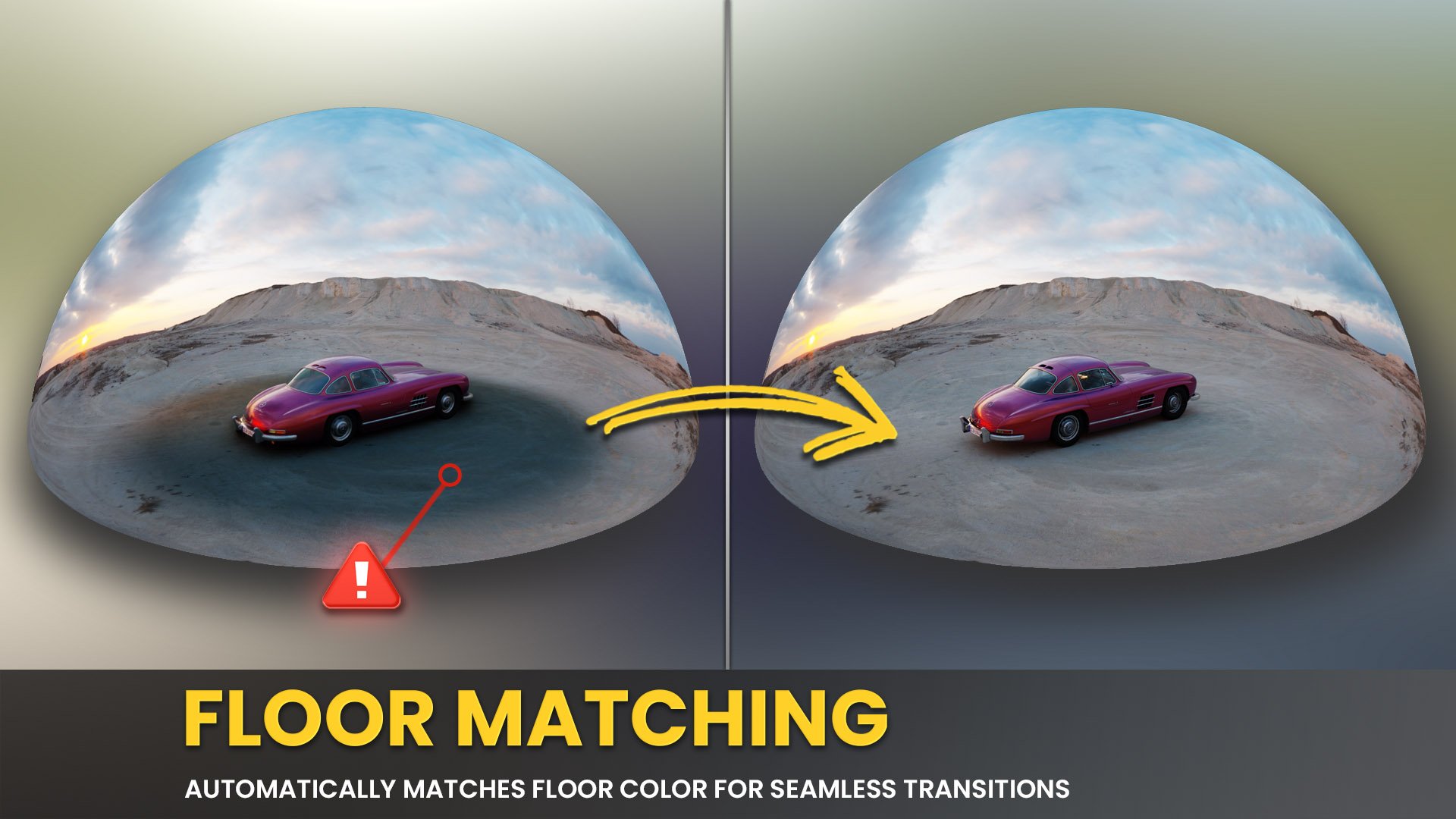 Most HDRI plugins struggle with mismatched floor planes. POLYDOME automatically matches the floor to the dome, creating seamless transitions without color shifts.