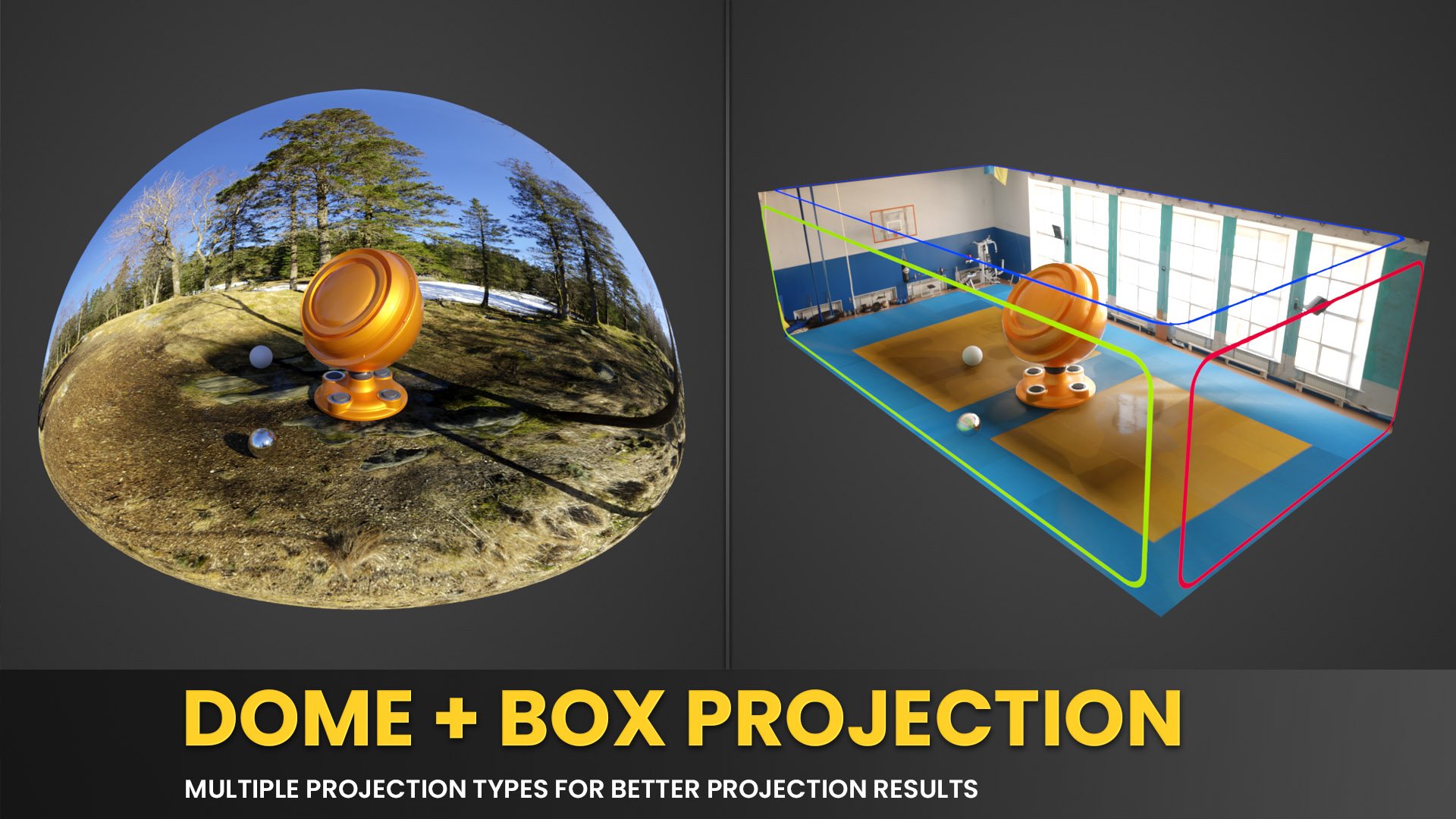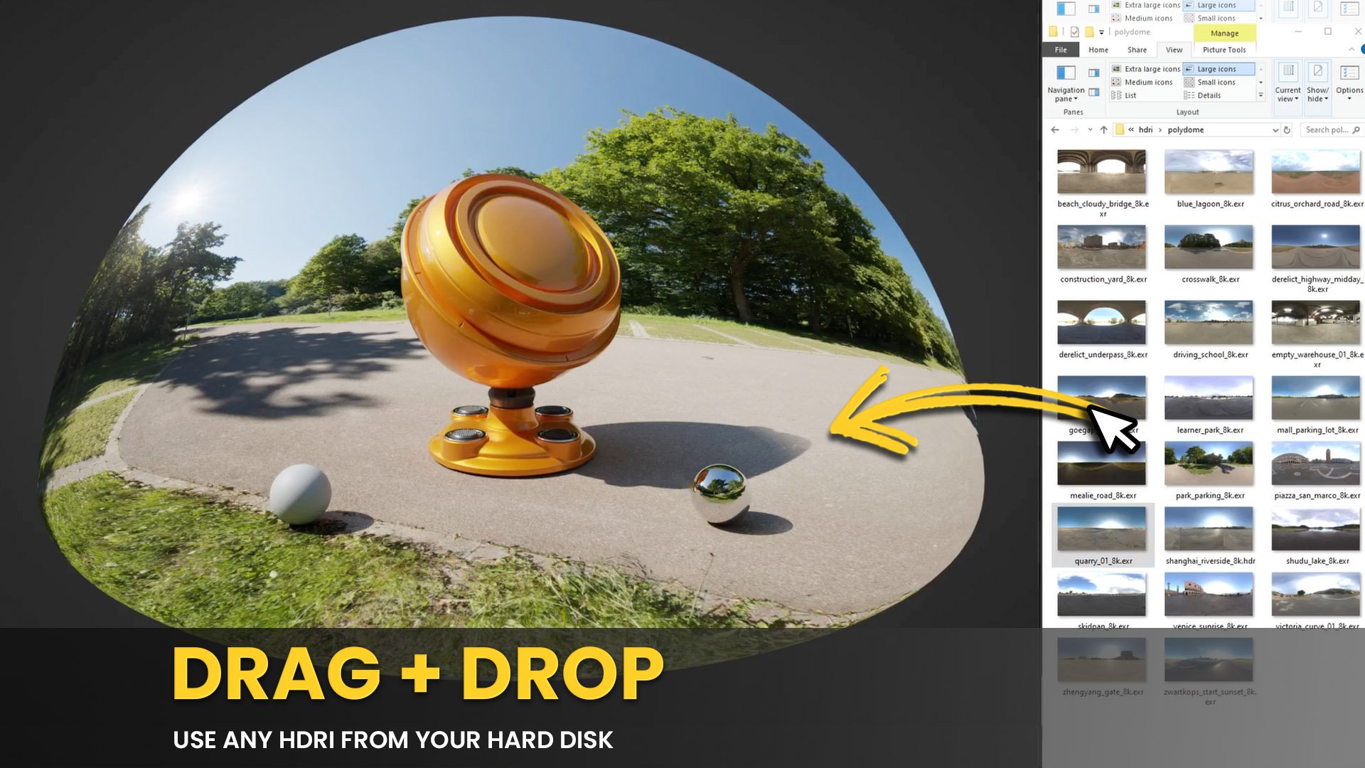 POLYDOME turns any HDRI into a usable set. With automatic floor matching and real-time feedback you will achieve stunning results — without the usual hacks.