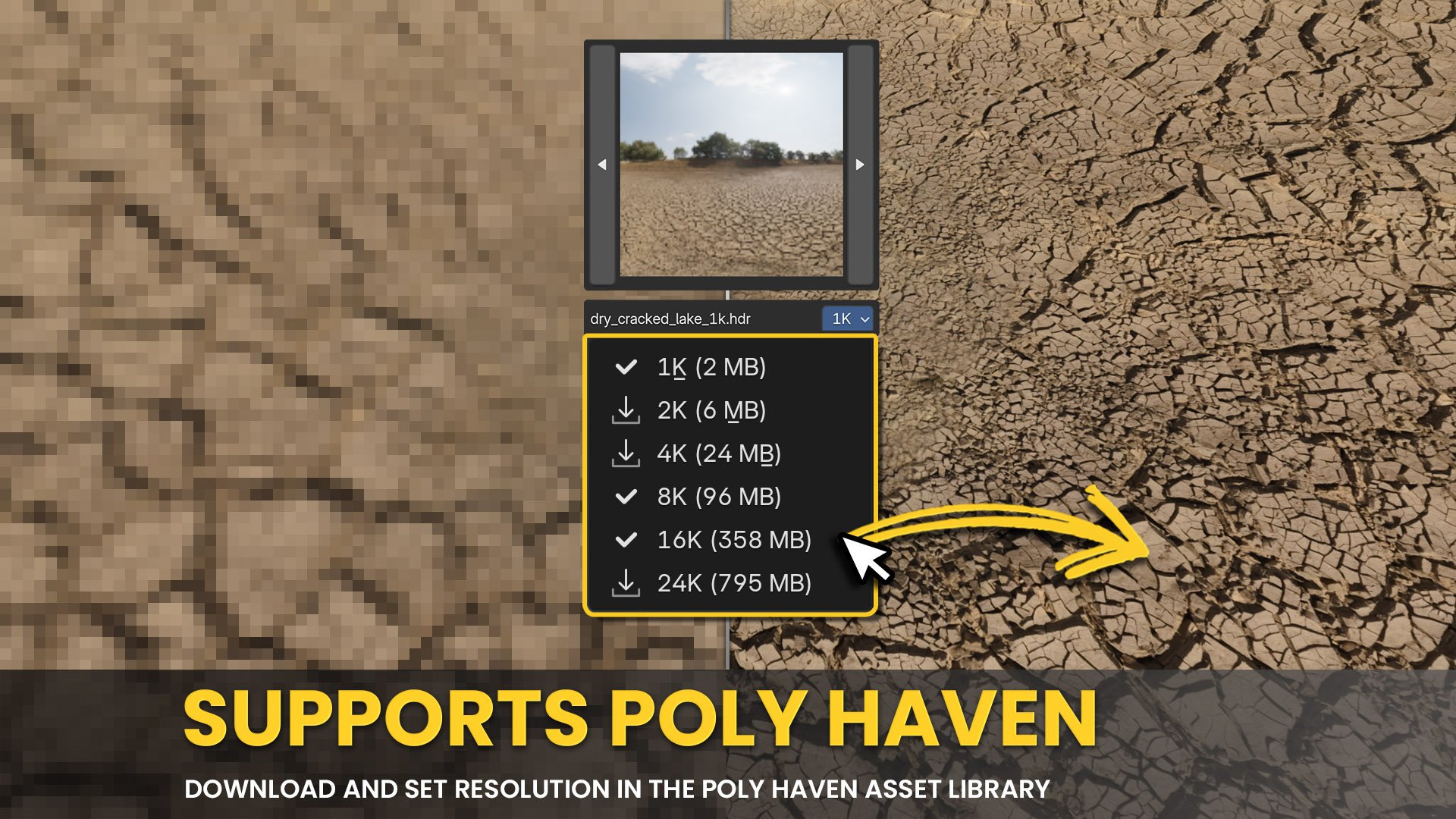 • Poly Haven HDRIs offer built in resolution switches but any HDRI will work just fine.