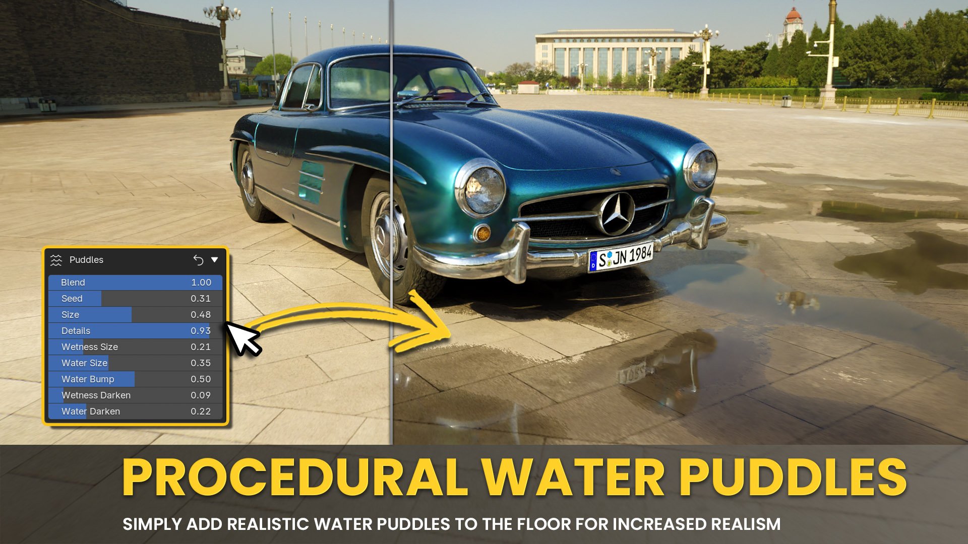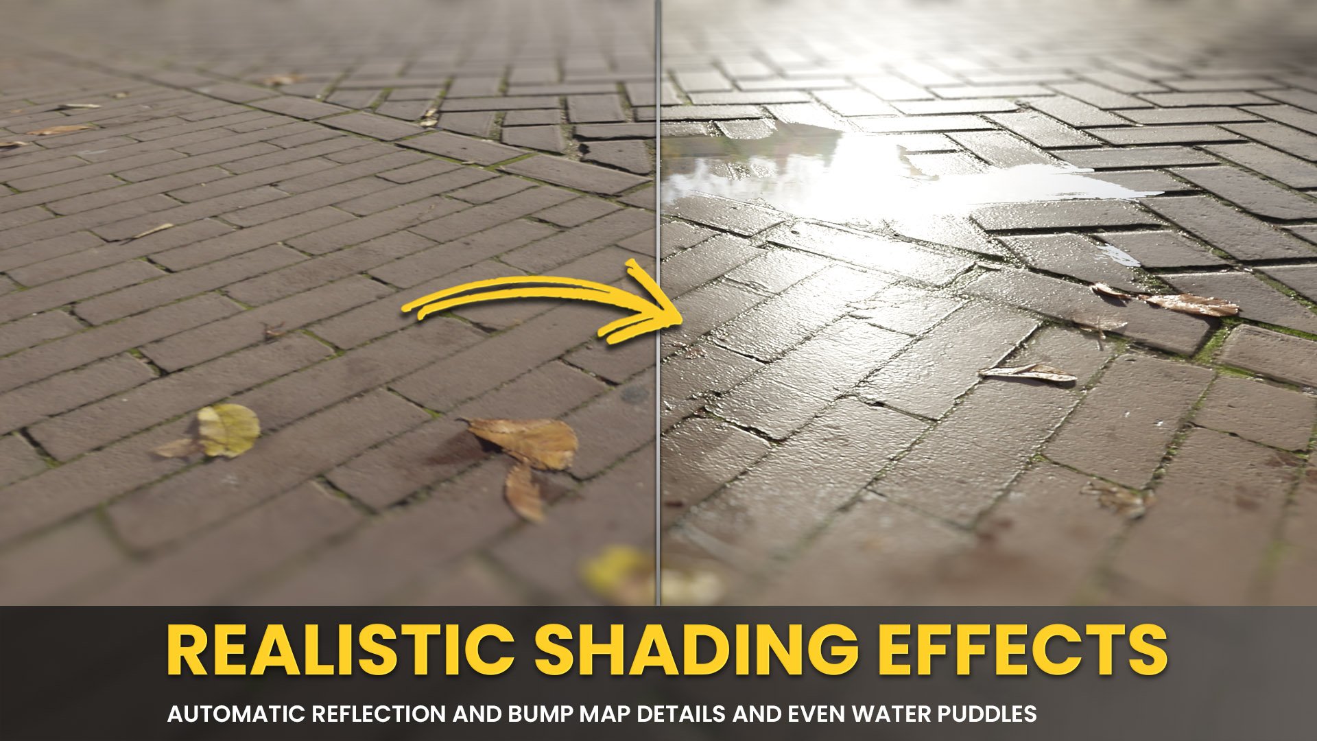 • Adjust puddle settings to instantly add realism to outdoor scenes.